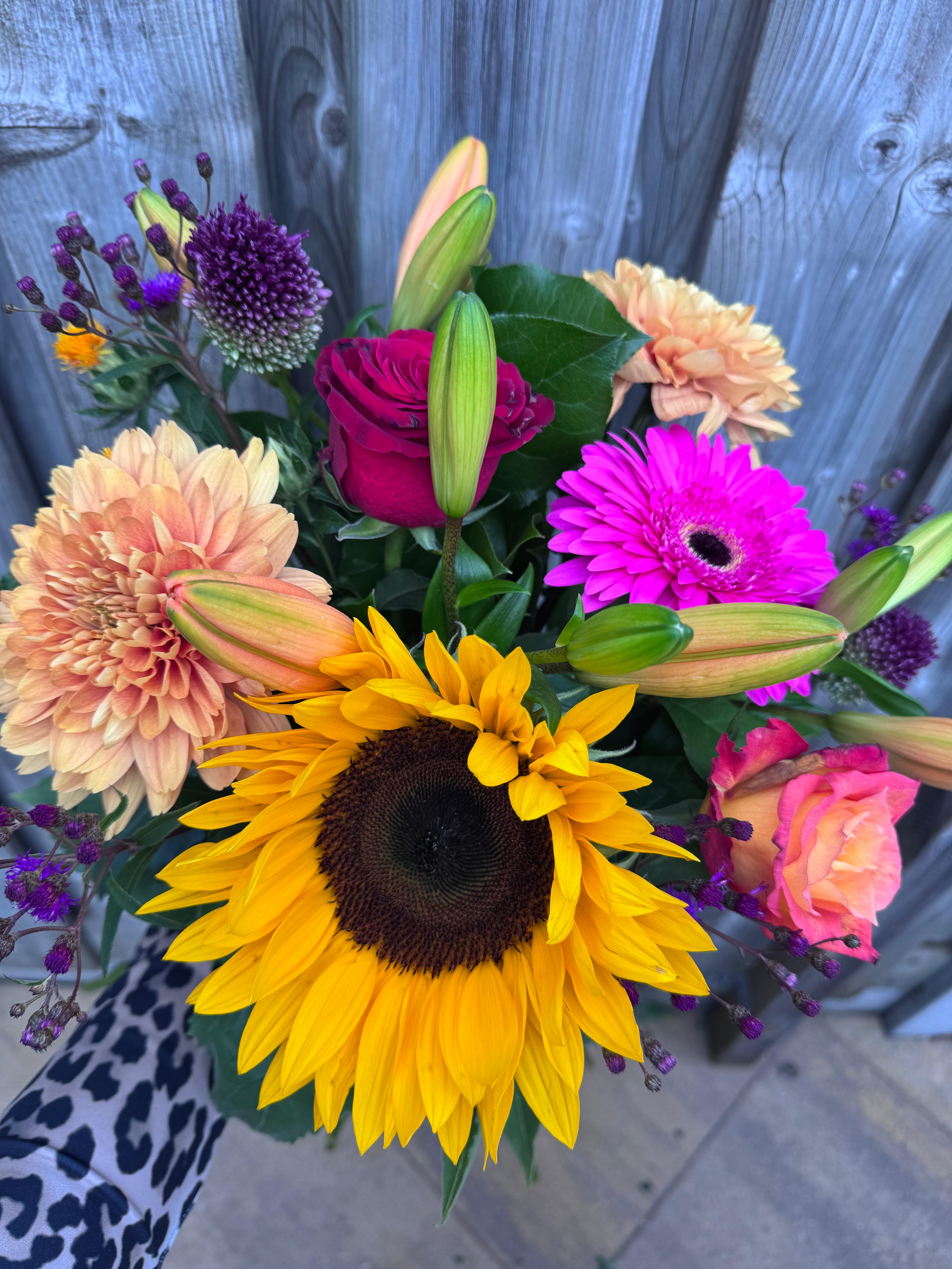 Gemengd rond geschikt boeket met diverse kleuren & bloemen. Vrolijk en geschikt voor elke gelegenheid.